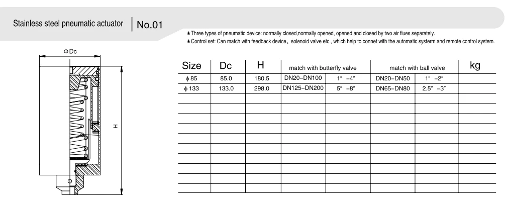 - Бір әрекетті жетек: серіппелі қалпына келтіру функциясымен жабдықталған, ол ауа беру ақаулығы кезінде автоматты түрде бастапқы орнына оралады, жоғары қауіпсіздікті қамтамасыз етеді және қауіпсіздік талаптары жоғары сценарийлер үшін жарамды.